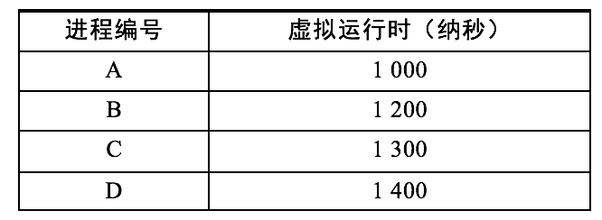 我们先通过例子来看CFS调度器。假如一台运行的计算机中本来拥有A、B、C、D四个进程。内核记录着每个进程的虚拟运行时,如表4所示: