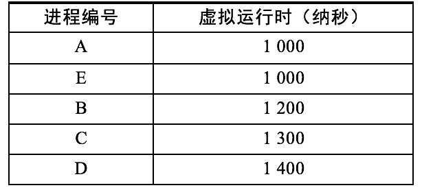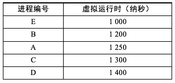 系统增加一个新的进程E。新创建进程的虚拟运行时不会被设置成0,而会被设置成当前所有进程最小的虚拟运行时。这能保证该进程被较快地执行。在原来的进程中,最小虚拟运行时是进程A的1 000纳秒,因此E的初始虚拟运行时会被设置为1 000纳秒。新的进程列表如表5所示: