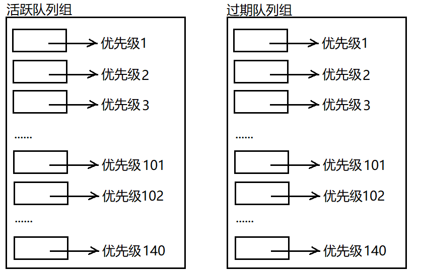 上面的描述没有考虑优先级。加入优先级后,情况会变得复杂一些。操作系统会创建140个活跃队列和过期队列,对应优先级0到139的进程。一开始,所有进程都会放在活跃队列中。然后操作系统会从优先级最高的活跃队列开始依次选择进程来执行,如果两个进程的优先级相同,他们有相同的概率被选中。执行一次后,这个进程会被从活跃队列中剔除。如果这个进程在这次时间片中没有彻底完成,它会被加入优先级相同的过期队列中。当140个活跃队列的所有进程都被执行完后,过期队列中将会有很多进程。调度器将对调优先级相同的活跃队列和过期队列继续执行下去。过期队列和活跃队列,如图2所示。