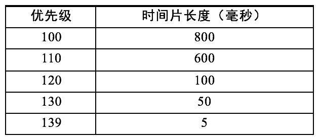 我们看到,O(1)调度器在挑选下一个要执行的进程时很简单,不需要遍历所有进程。但是它依然有一些缺点。进程的运行顺序和时间片长度极度依赖于优先级。比如,计算优先级为100、110、120、130和139这几个进程的时间片长度,如表3所示:
