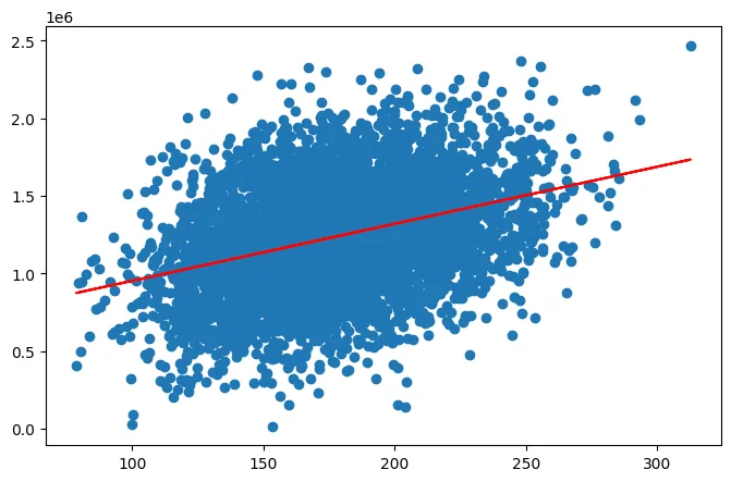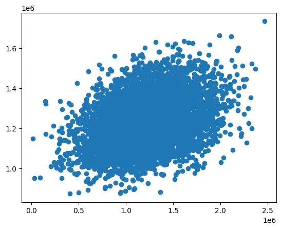 plt.scatter(data.loc[:, 'Area Population'], data.loc[:, 'Price'])