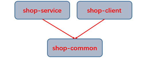 通过上面的代码我们不难发现,项目被分成了三个模块,分别是shop-common、shop-service和shop-client,他们之间的依赖关系如下图所示: