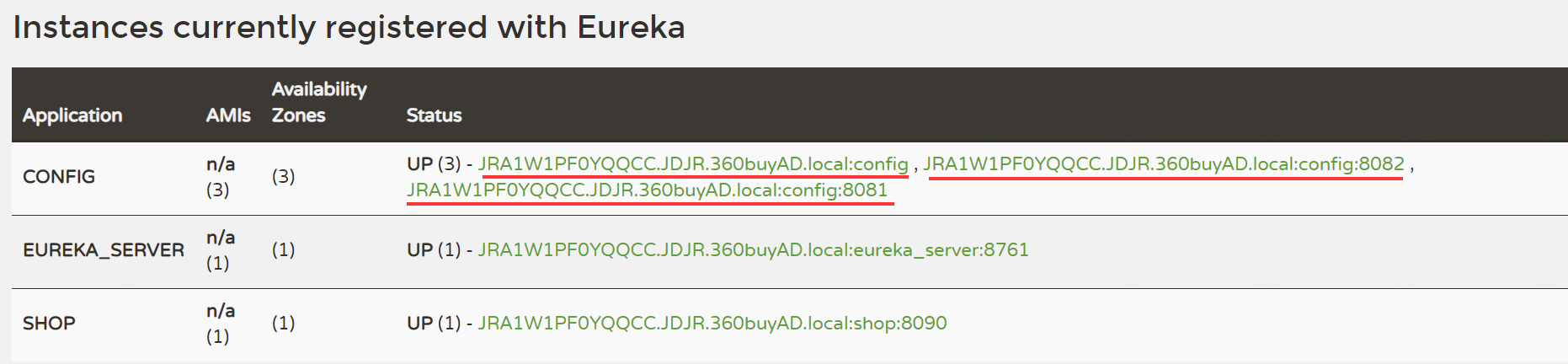 在Eureka Server的界面可以看到,三个配置中心的实例已经注册到了Eureka Server上面: