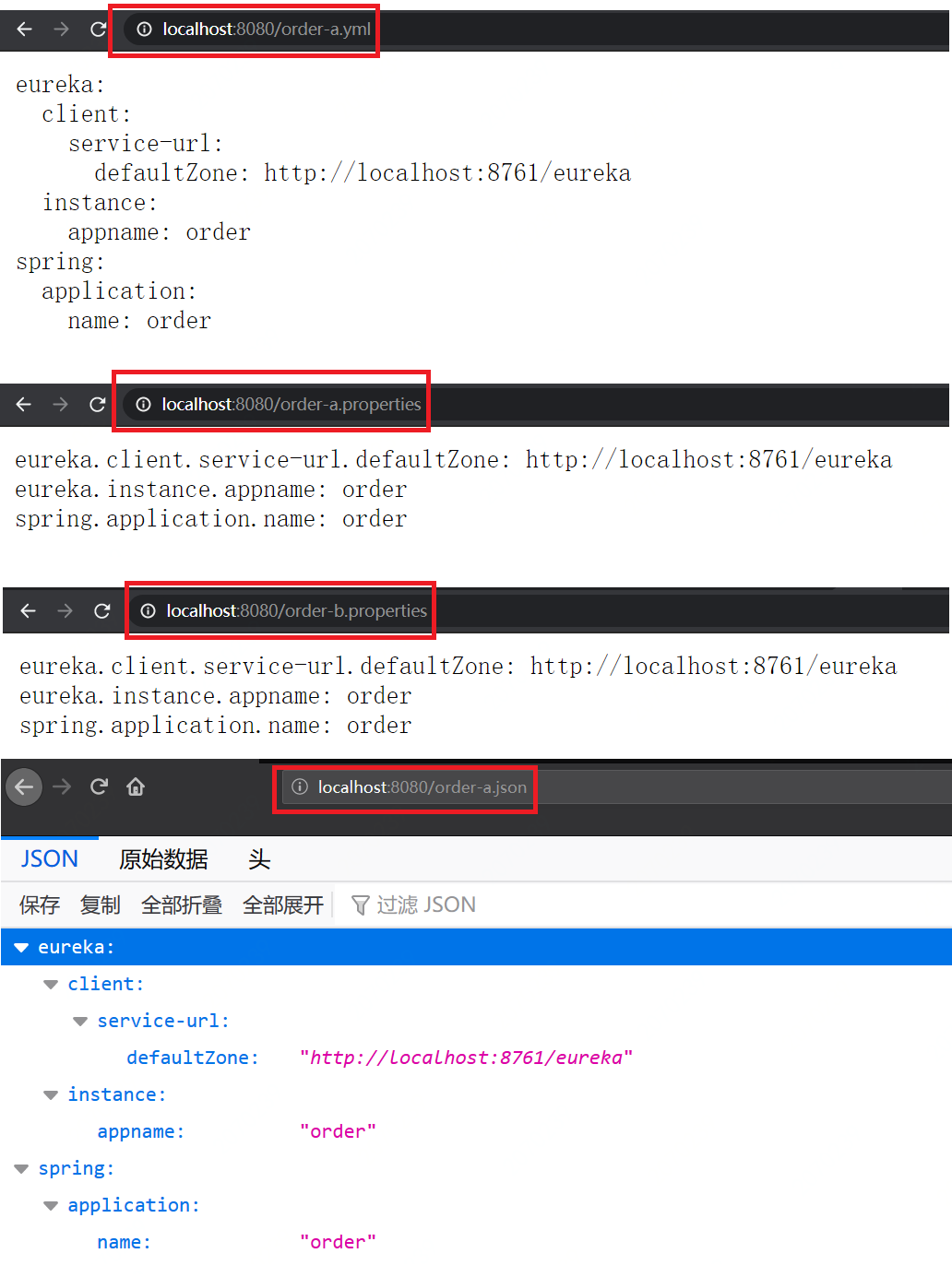 可以看到,虽然我们只是在Master分支上提交一个order.yml,但是我们访问order.yml却无法访问,访问order-a.yml、order-b.yml、order-a.properties、order-b.properties、order-a.json、order-b.json却没有问题,也就是说SpringCloudConfig帮我们做了转换,那么具体的转换规则是什么呢?在日志里可以看到/{label}/{name}-{profiles}.yml