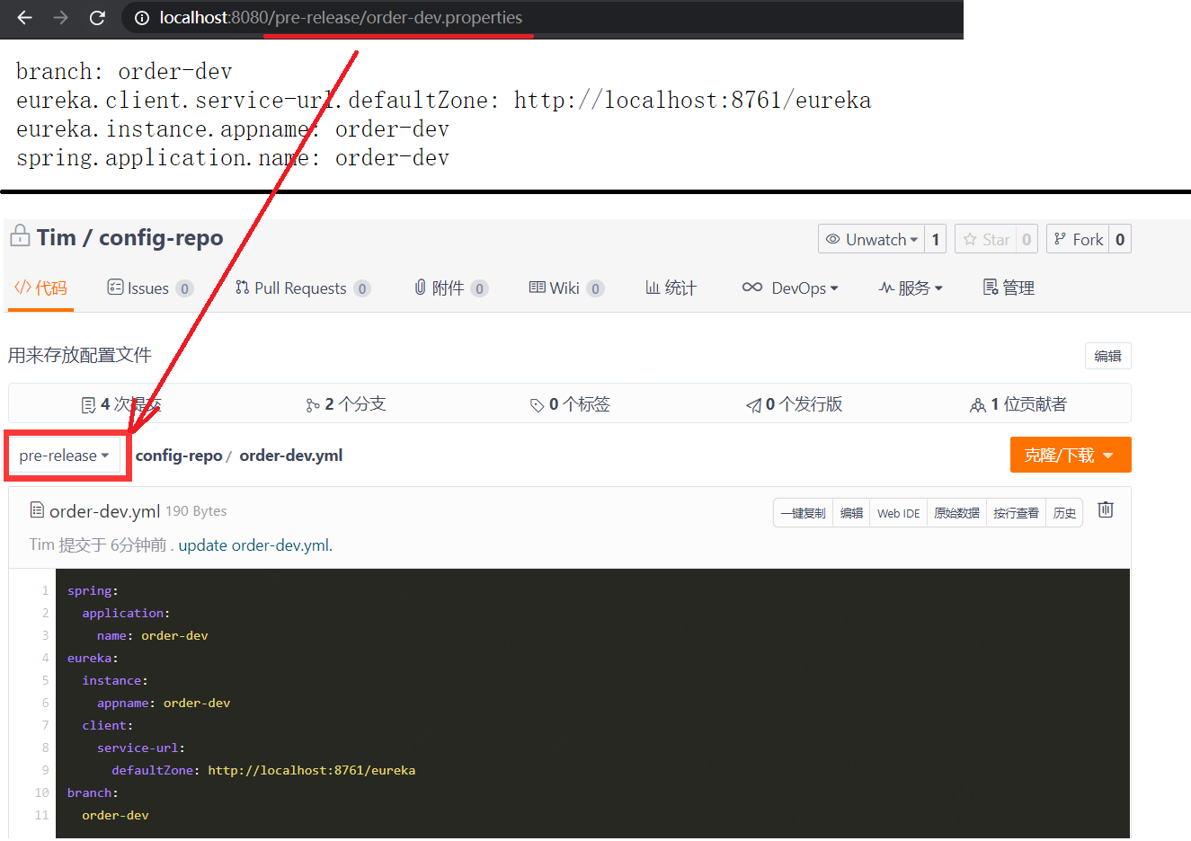 另外还有一点需要注意,那就是如果你需要的配置文件是shop-dev.yml,Git仓库同时存在shop.yml与shop-dev.yml,那么统一配置中心在拉取配置文件的时候,会把shop.yml和shop-dev.yml两个文件同时拉取下来,并且进行内容合并,所以我们通常遵循如下原则,那就是公共的配置内容写在shop.yml(对于本例而言)中,不同环境的配置内容写在shop-dev.yml或者shop-test.yml中。