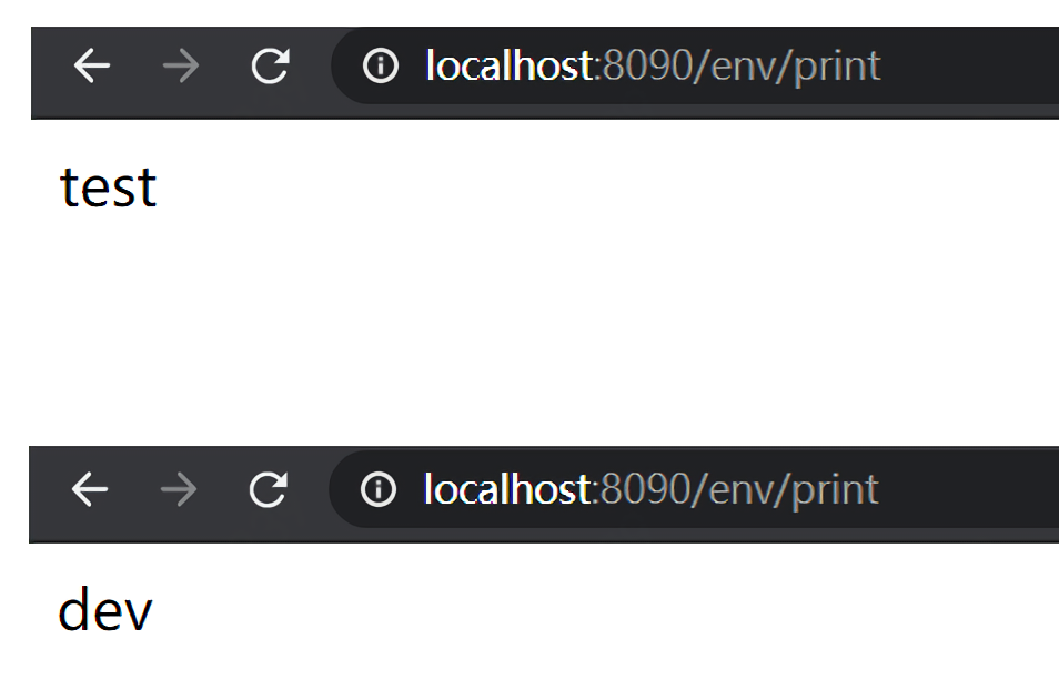 当我们把bootstrap.yml中的profile属性设置为dev的时候,拿到的配置文件就是shop-dev.yml,此时访问打印环境属性的接口打印出来就是dev;当我们把bootstrap.yml中的profile属性设置为test的时候,拿到的配置文件就是shop-test.yml,此时访问打印环境属性的接口打印出来就是test: