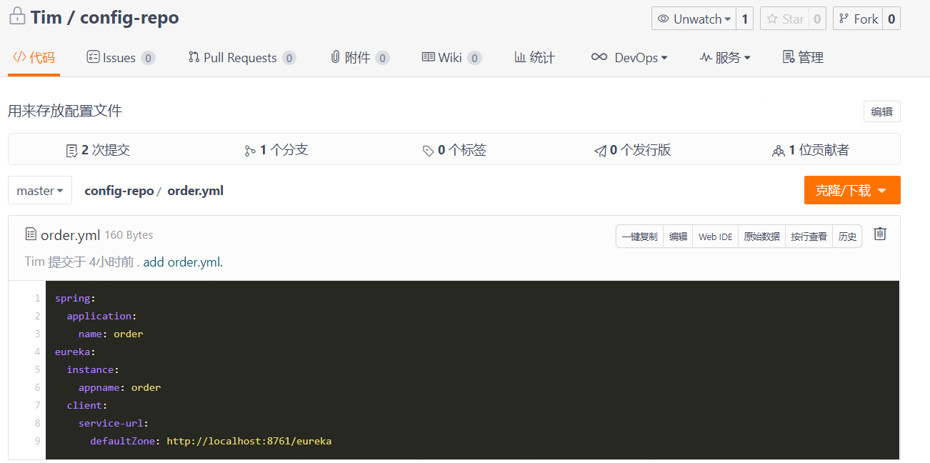 不难发现,我们在上面的配置文件中配置了Git的仓库地址、用户名以及密码,因为从架构图可以看出,其他服务组件配置文件需要放在一个Git仓库中,可以是Github、GitlabGit、Gitee或者是自己搭建的Git私服。我演示的时候直接放在了Gitee(码云)上面: