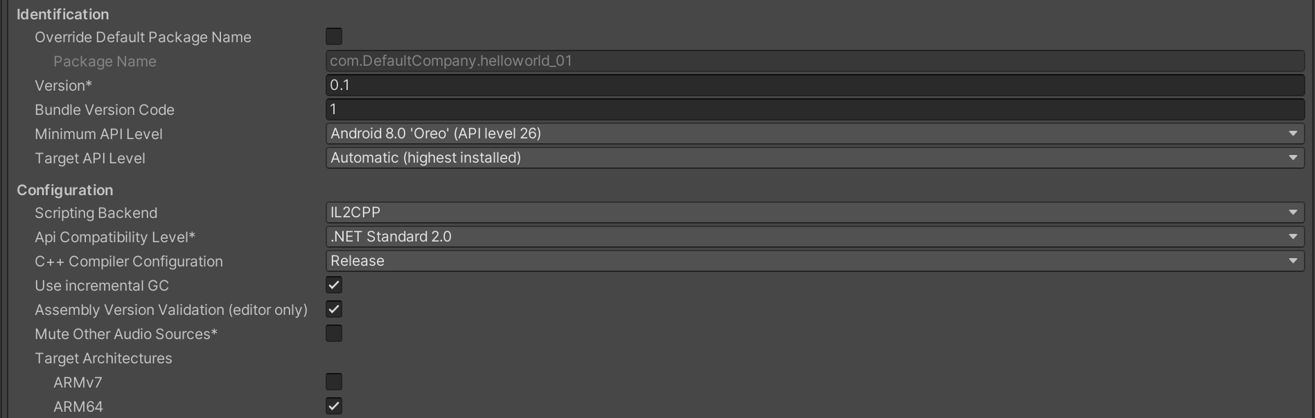 设置Player的中的参数:Android API版本,L2CPP,ARM V8,XR Plugin选择Android,Build And Run选设备: