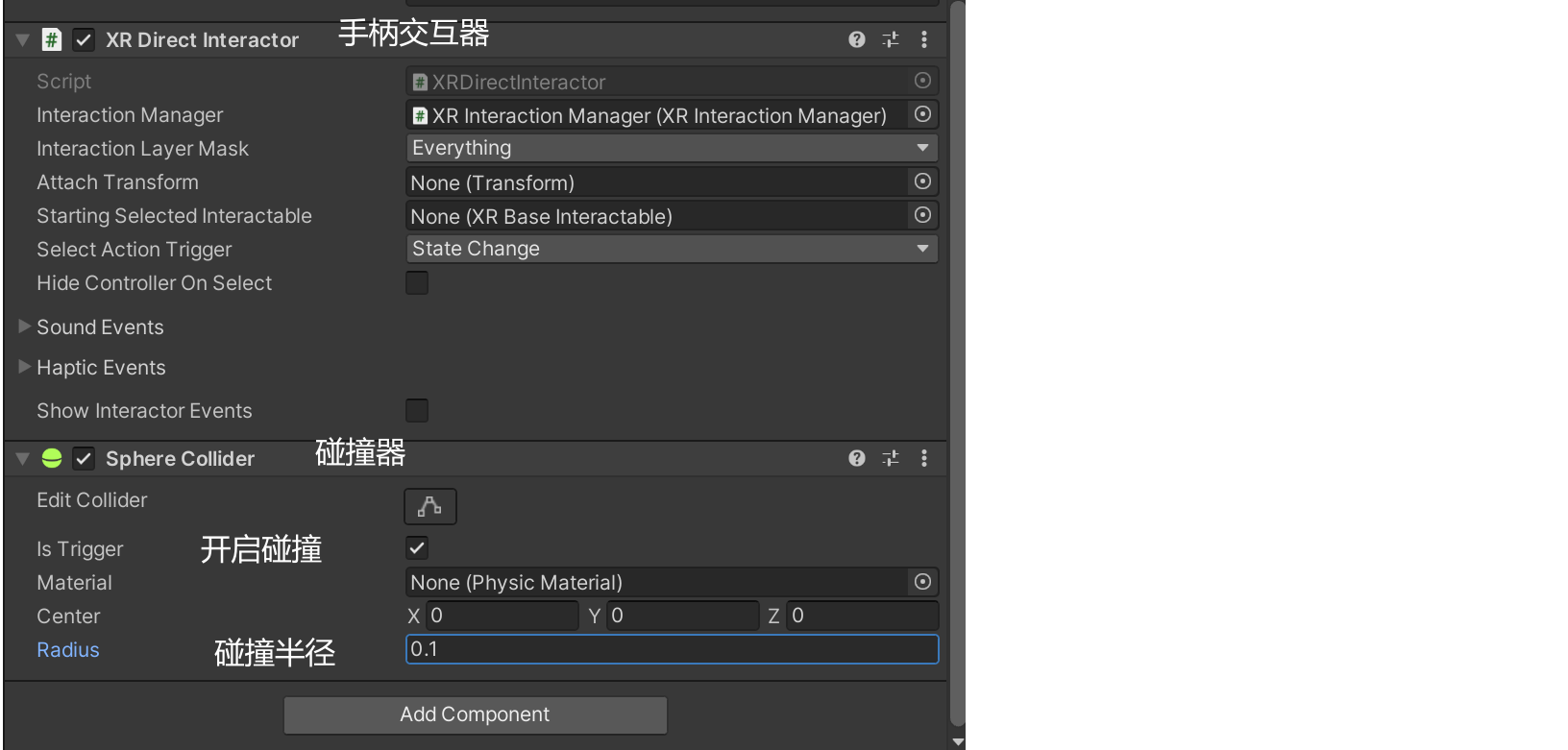 给右手手柄添加碰撞器和手柄和交互器,同时为了表示左右手的模型,把手形状的预制体加进去,在 Packages - XR Plugin下面的 Prefab下可以找到: