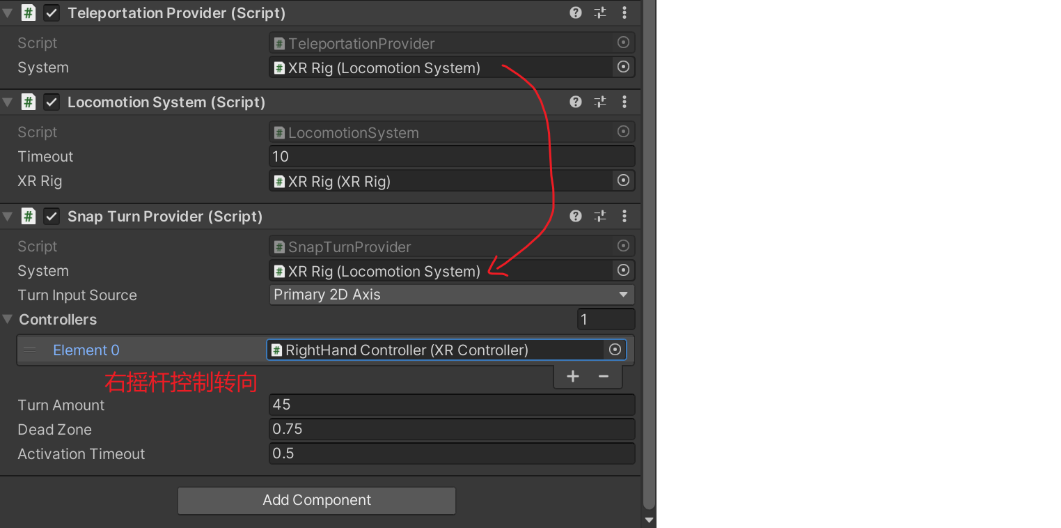 XR Rig添加SnapTurnProvider组件,指定控制移动的System即可: