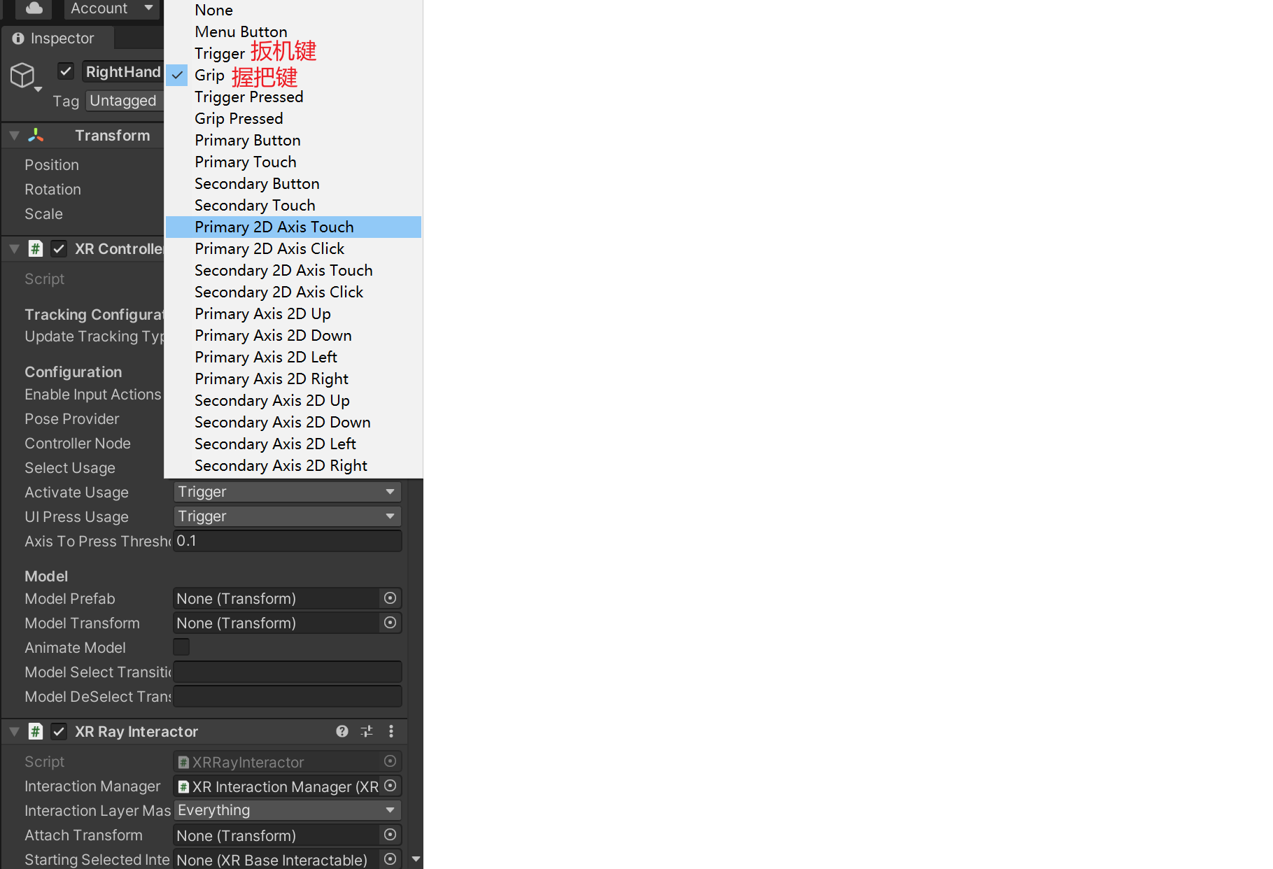 关于手柄的一些设置,比如设置射线颜色,触发按钮等等: