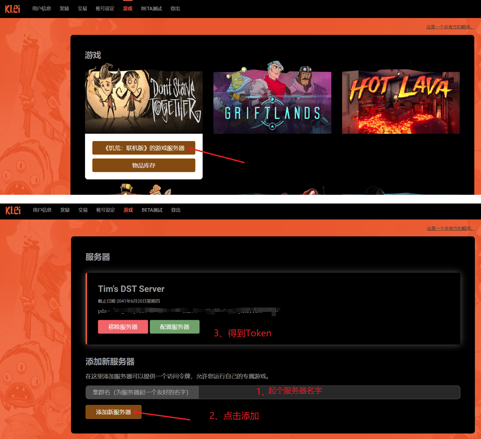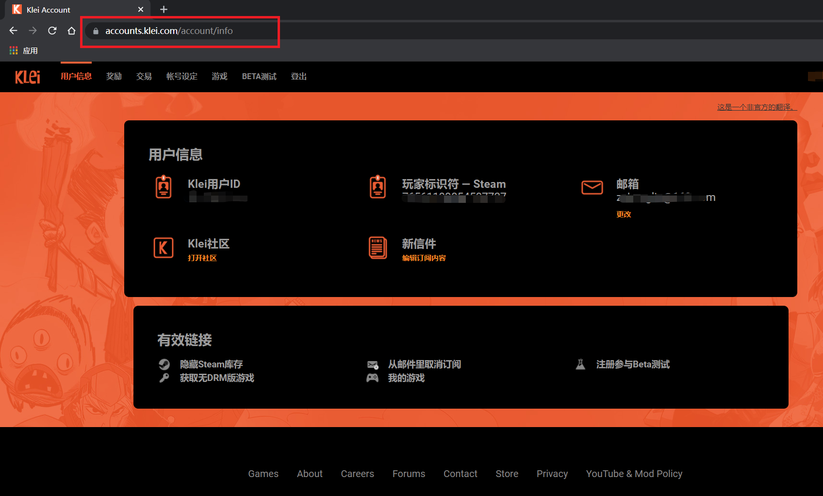 下面需要获取Token,先用steam账户登录https://accounts.klei.com/account/info