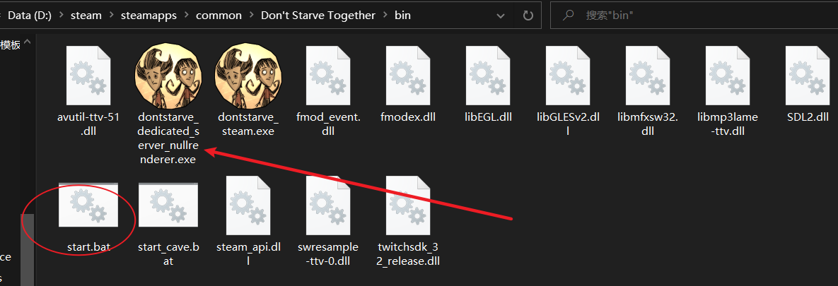 将上述准备工作做完后,就进入最后一步,创建启动脚本和启动服务器了。进入steam的安装目录,进入steamapps/common/Don’t Starve Together/bin,可以看到一个dontstarve_dedicated_server_nullrenderer.exe这个文件,从这个应用程序的名字就可以知道,就需要通过他来创建一个无画面的服务器。