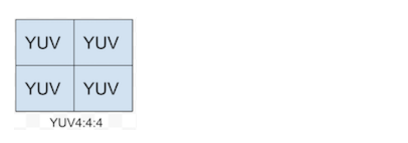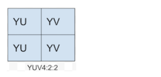 对于四个像素,YUV4:2:2格式需要4×8 + 2×8 + 2×8 = 64位,每个像素深度为16位。