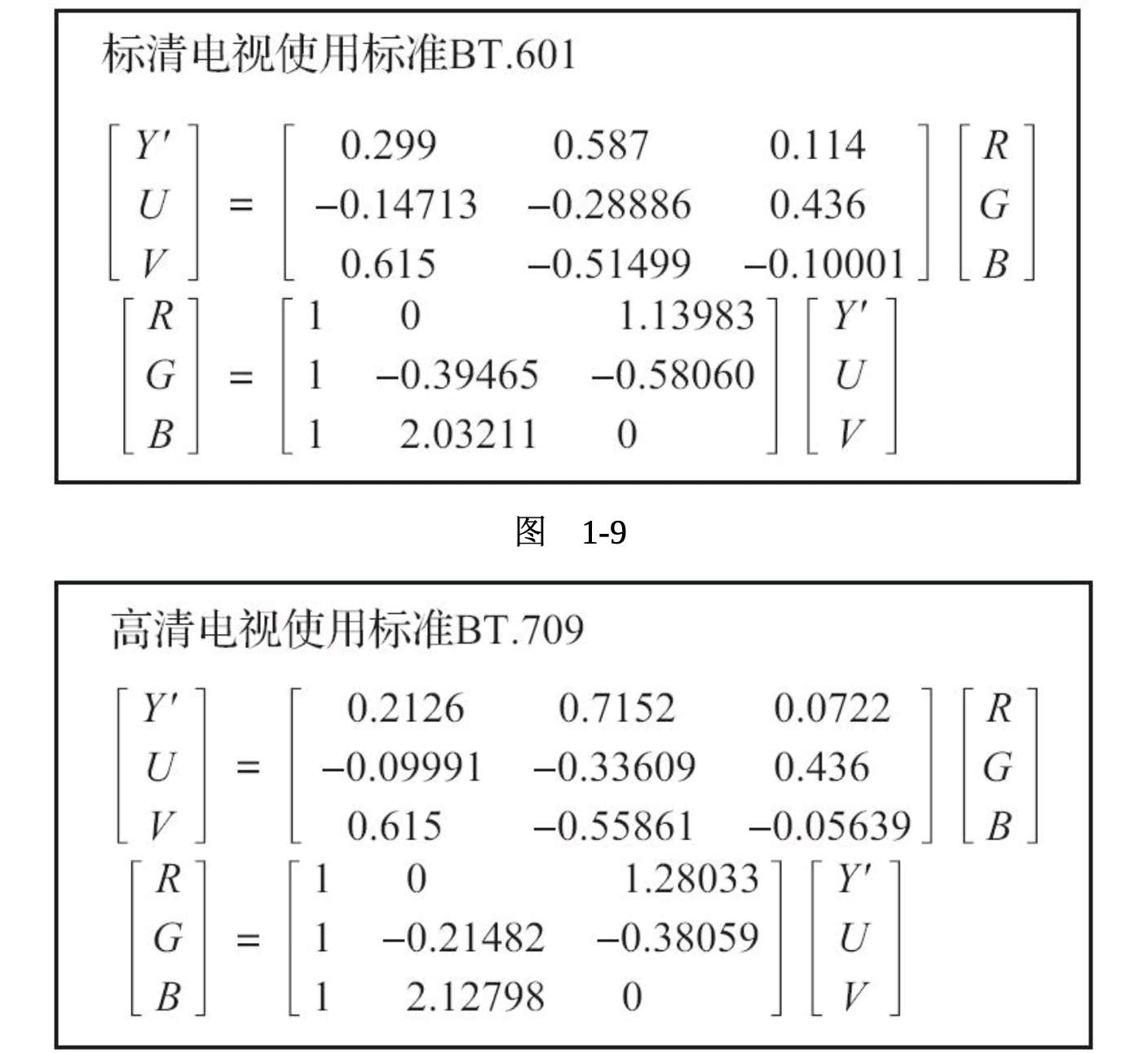 凡是渲染到屏幕上的东西(文字、图片或者其他),都要转换为RGB的表示形式,那么YUV的表示形式和RGB的表示形式之间是如何进行转换的呢?对于标清电视601标准,它从YUV转换到RGB的公式与高清电视709的标准是不同的,通过如下的计算即可:
