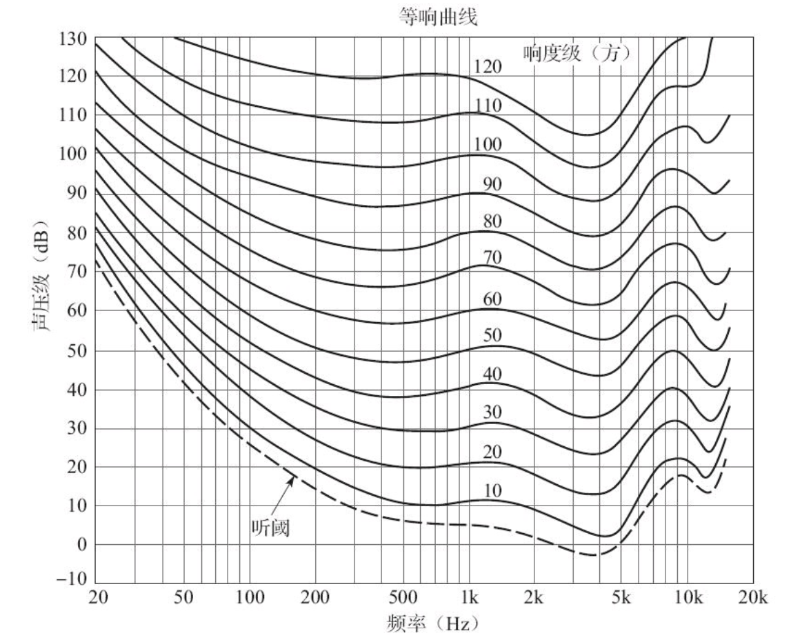 频率范围内的声音比较敏感,而对于较低或较高频率的声音,敏感度就会有所减弱;在声压级较低时,听觉的频率特性会很不均匀;而在声压级较高时,听觉的频率特性 会变得较为均匀。频率范围较宽的音乐,其声压以80~90dB