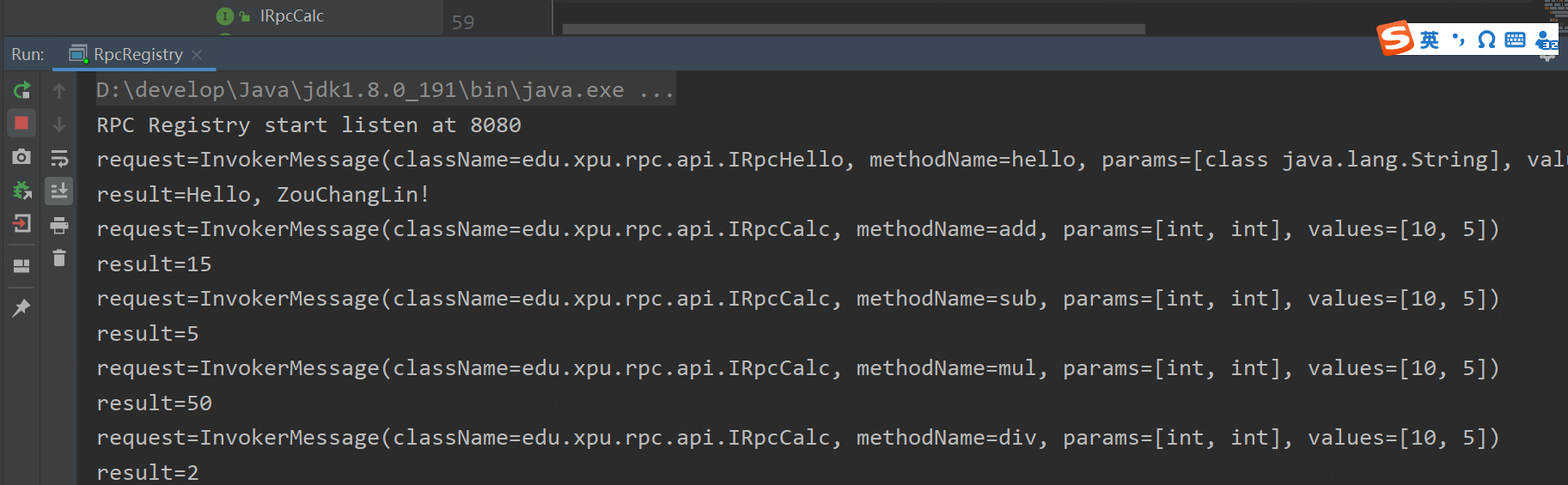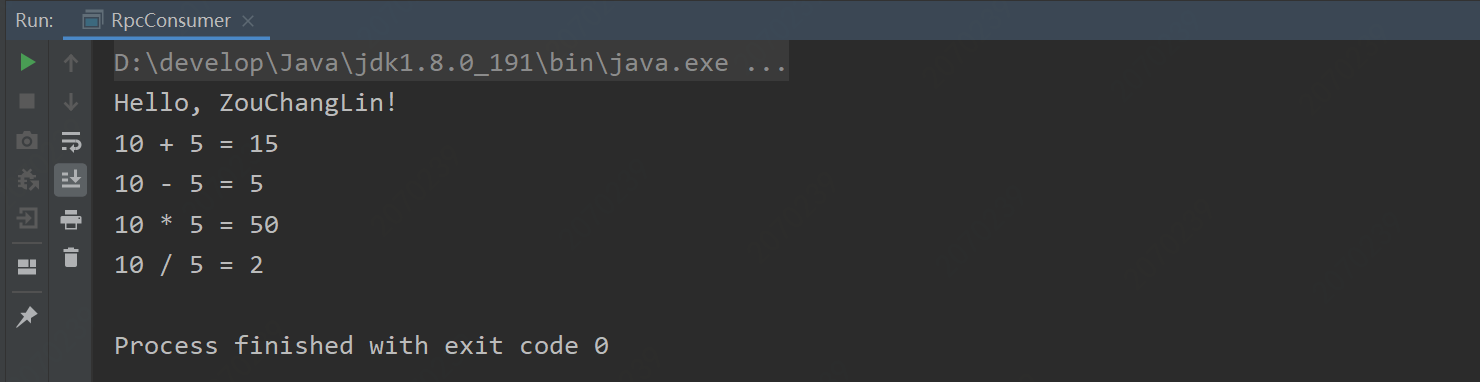 这样就算是完成了整个流程,下面开始测试一下吧,测试的RpcConsumer.java代码如下: