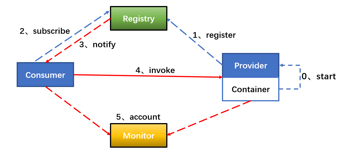 1、Spring的IOC容器启动 2、把服务注册到注册中心(zookeeper软件)中 3、消费者启动时会把它需要用到的服务从注册中心拉取下来 4、提供者的地址发生改变时,注册中心会马上通知消费者 5、根据注册中心中的服务地址直接可以调用提供者了,如果调用了提供者,就会把提供者的地址主动缓存起来 6、监控消费者调用提供者的次数