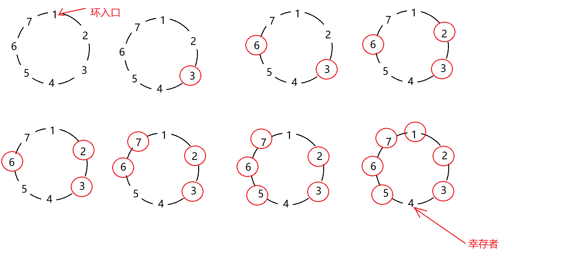 这样如何往复的淘汰直到只剩下最后一个人为幸存者,使用链表即可完成:
