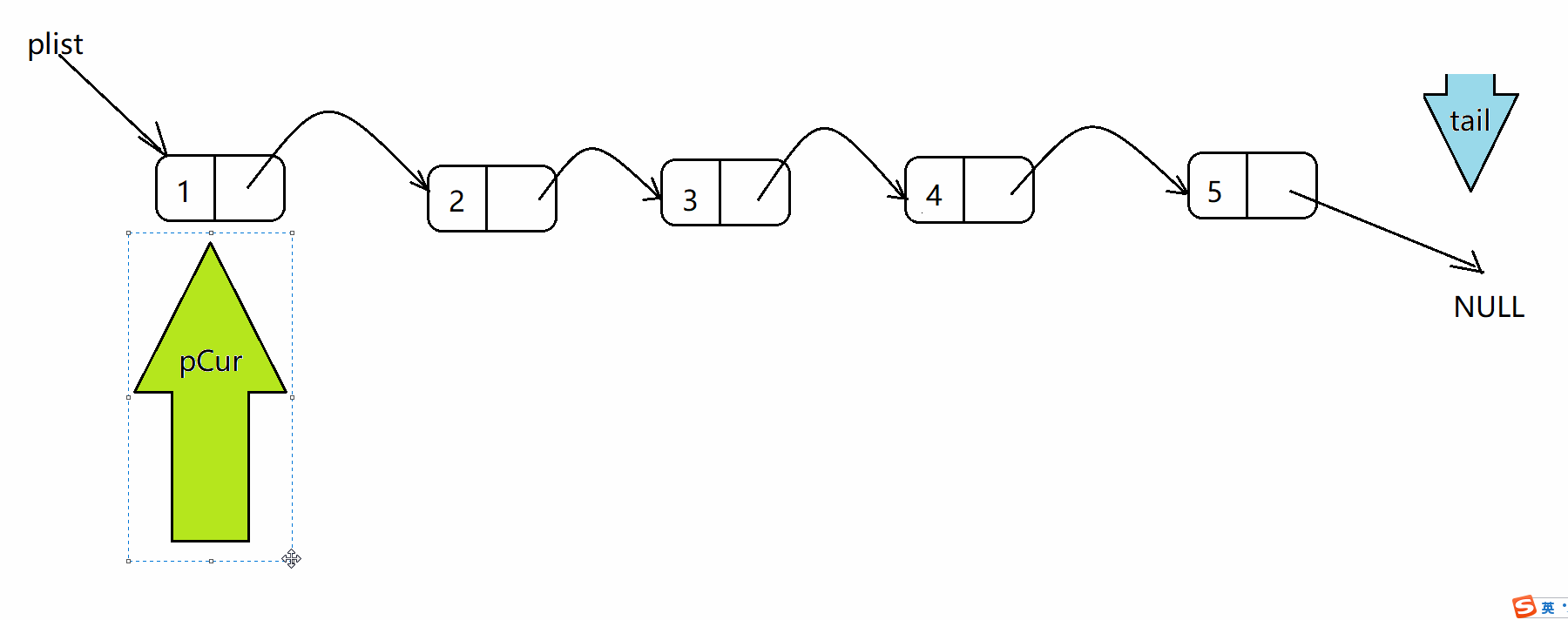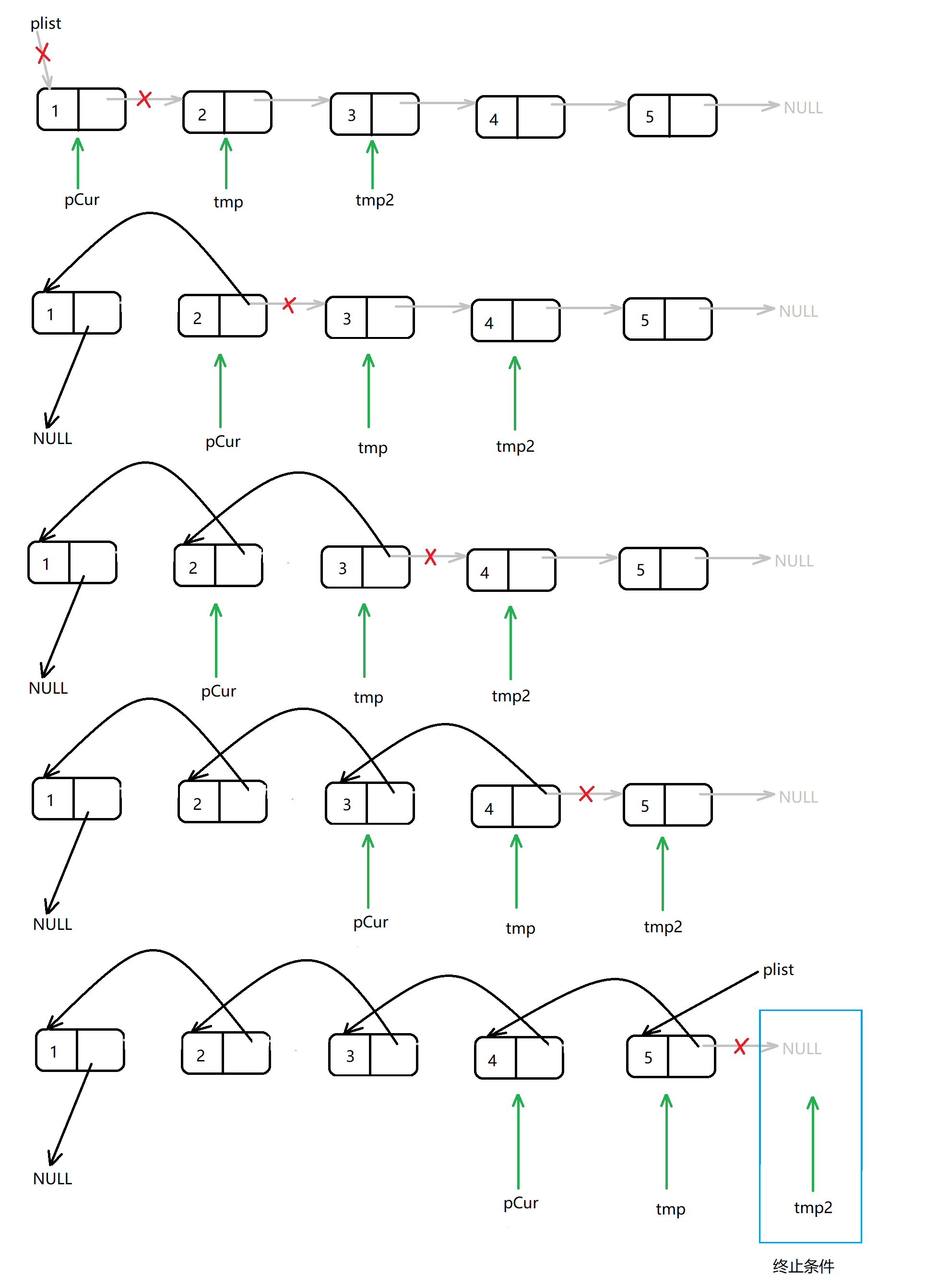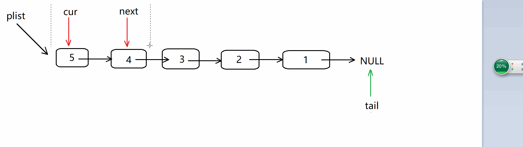 普通的方式逆序打印链表 此方法的思路就是使用两个指针,一个指针tail负责指向上一次刚刚被打印的元素,这样每次pCur指针每次都以tail指针标记作为结束,这样直到tail指针指向头结点的时候就证明已经打印完成了。看看下面这个小电影就能很容易的明白: