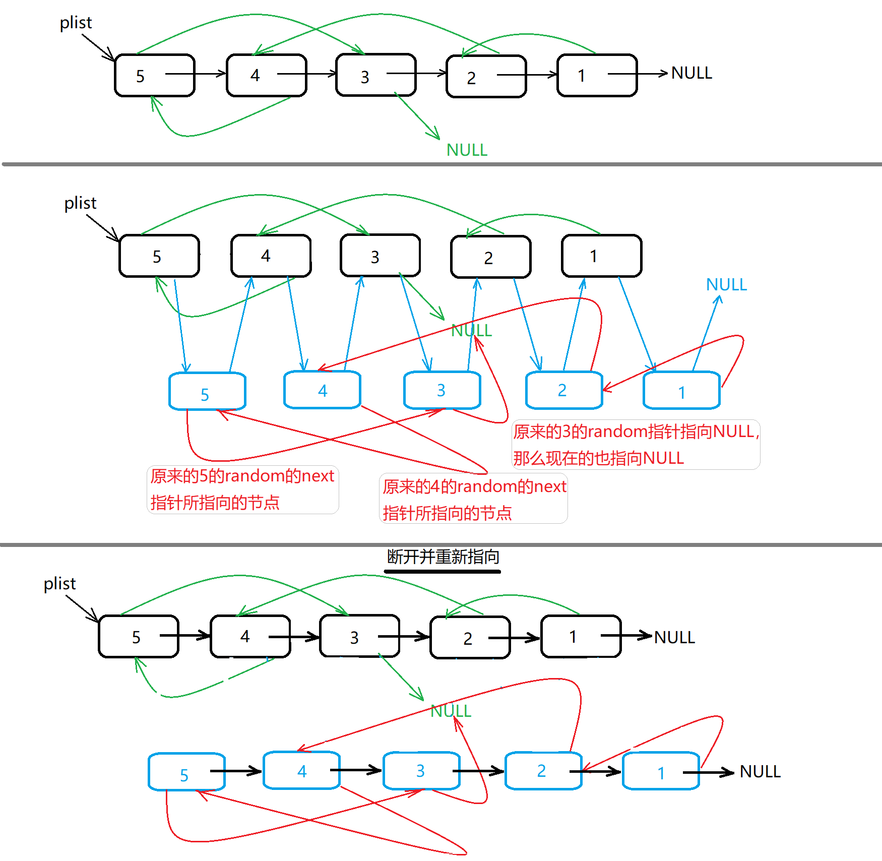 1、先先断开原有链表,插入新节点,如图所示:5后面插入新节点5,4后面插入新节点4,….新节点1后面补成NULL 2、 复制随机指针,这里的随机指针如何才能找到之前的random指针的指向呢?很简单,原来的节点的random指针指向的节点的next所指向的地方就是新节点的random指向应该指向的地方,这样我们就可以很方便的完成随机指针指向的复制 3、 分离两条链表,这个也是比较容易的,让一个指针连续走两步,执行链接!