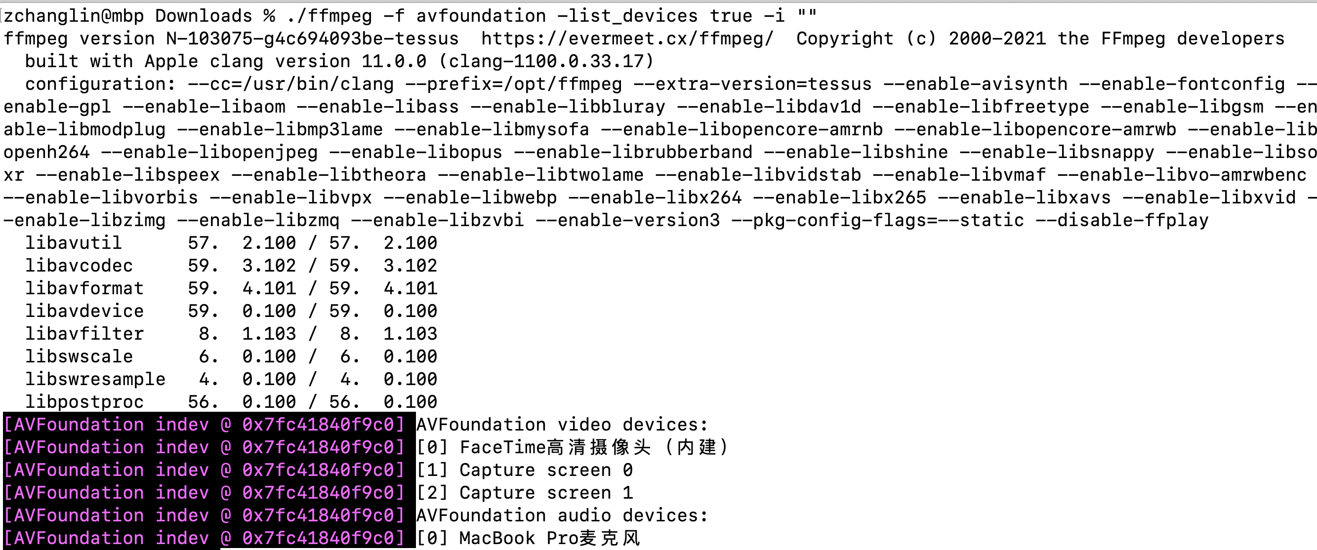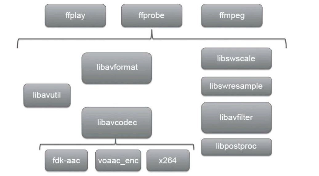 AVDevice:输入输出设备库,比如,需要编译出播放声音或者视频的工具ffplay,就需要确保该模块是打开的,同时也需要libSDL的预先编译,因为该设备模块播放声音与播放视频使用的都是libSDL库。