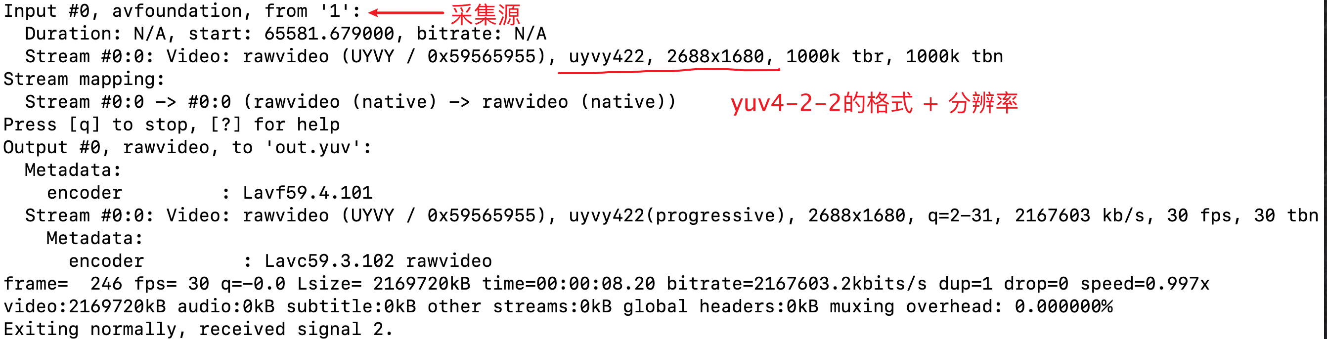 录制的格式是yuv,这是一种原始数据流,不包含视频的任何头信息,所以注意如果是 yuv 视频,必须是告诉 ffplay 宽高和帧率才可以播放,参数是开始录制时 ffmpeg 的提示内容: