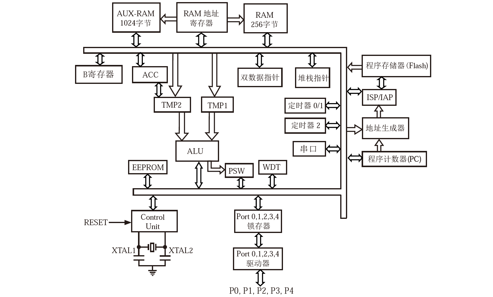 STC89C52系列单片机的内部结构框图如下图所示。STC89C52单片机中包含中央处理器(CPU)、程序存储器(Flash)、数据存储器(SRAM)、定时/计数器、UART串口、I/O接口、EEPROM、看门狗等模块。STC89C52系列单片机几乎包含了数据采集和控制中所需的所有单元模块,可称得上一个微机片上系统。内部结构图: