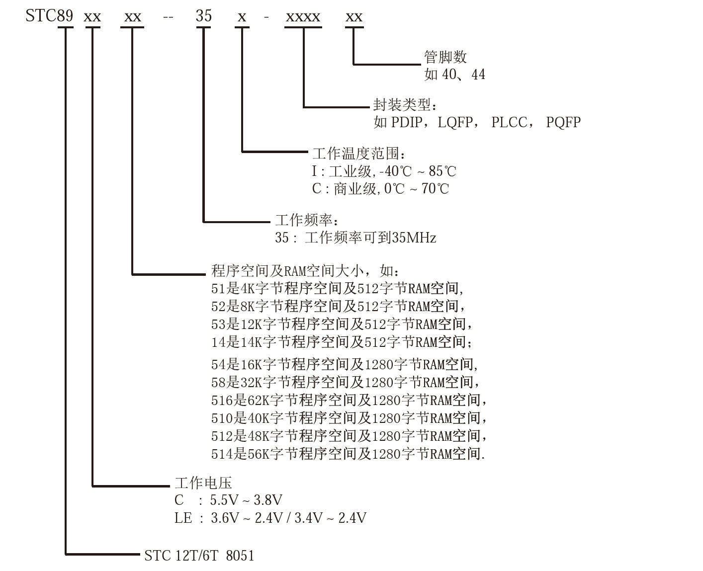 STC(南通国芯微电子)公司的51单片机系列是8位单片机,所以RAM为512字节,ROM:8K(Flash),工作频率:11.0592MHz(有些是12MHz),命名规则如下: