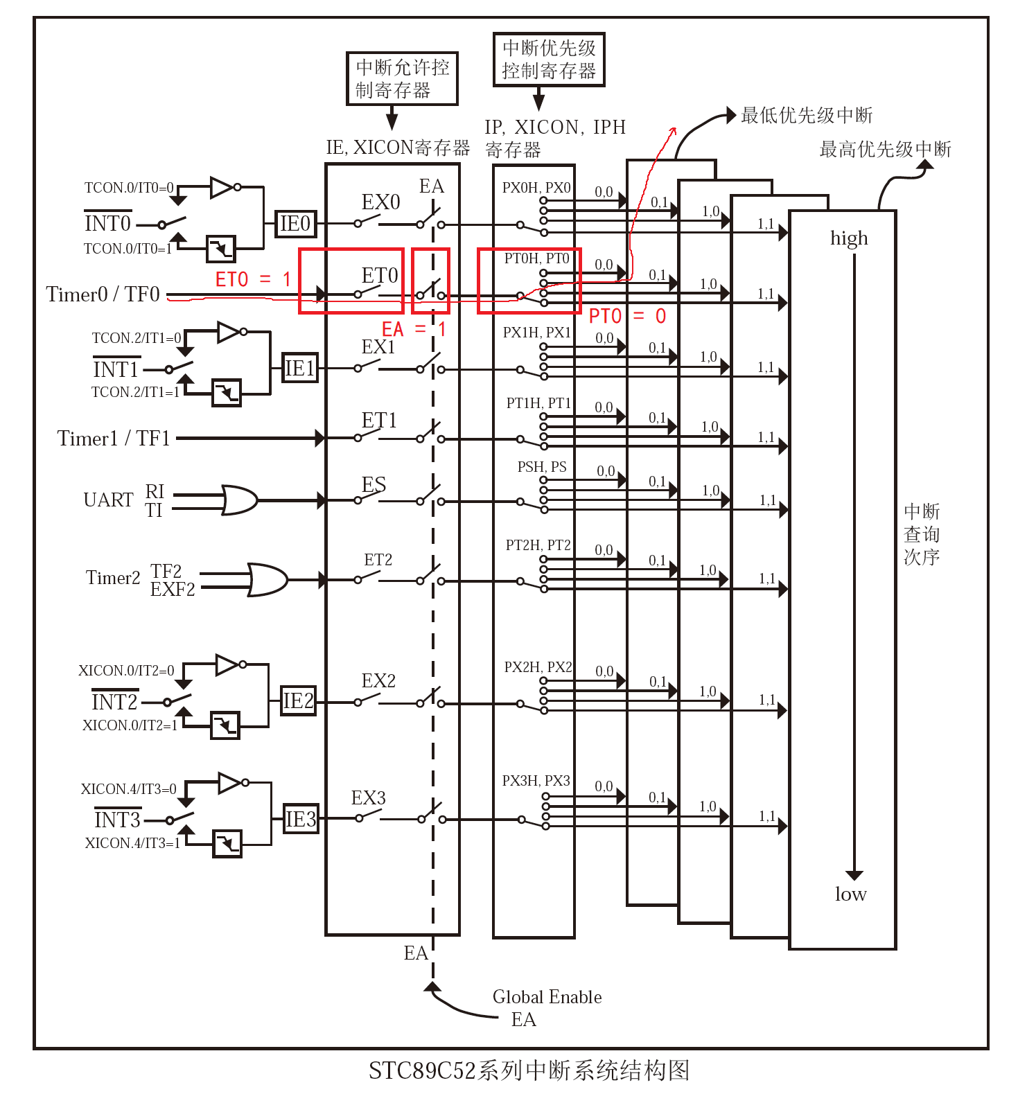 STC89C52系列单片机提供了8个中断请求源,它们分别是:外部中断O(INTO)、定时器0中断、外部中断1(INT1)、定时器1中断、串口(UART)中断、定时器2中断、外部中断2(INT2)、外部中断3(INT3)。所有的中断都具有4个中断优先级。中断的资源和单片机的型号是关联在一起的,不同的型号可能会有不同的中断资源,例如中断源个数不同、中断优先级个数不同等等,下面是STC89C51的中断号: