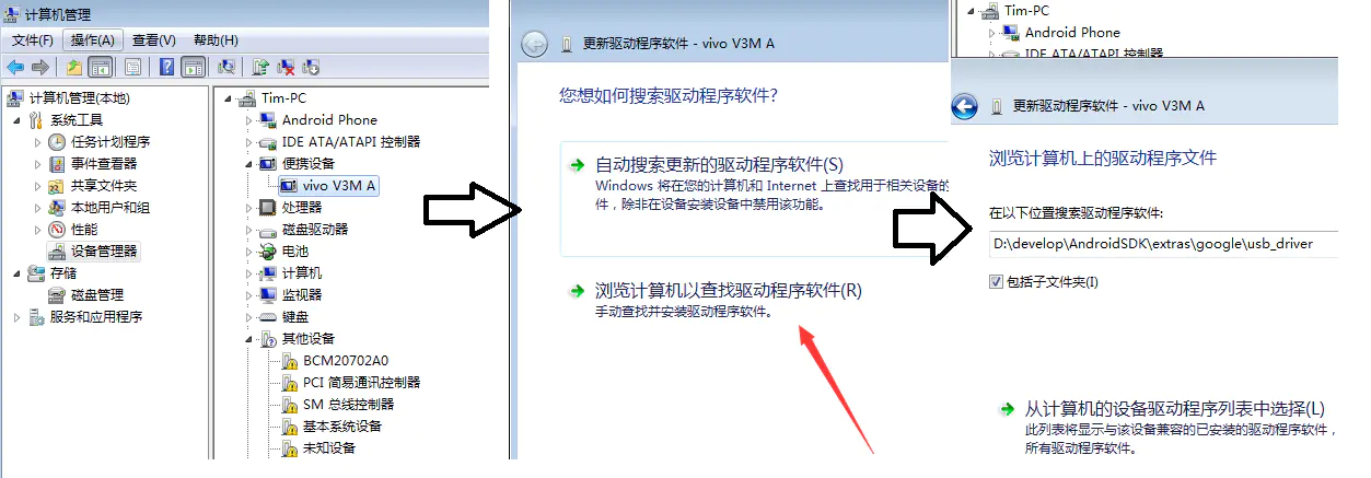在计算机管理----》设备管理器----》其他设备 里面找到ADB Interface,因为不只要安装Google USB Driver,而且ADB的驱动也要有,ADB驱动下载地址