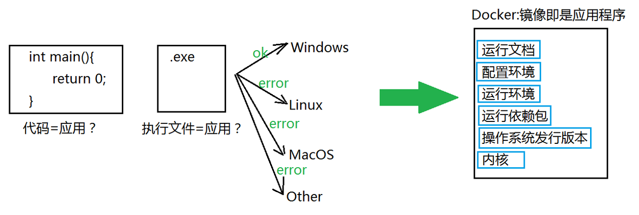 这就好比,我安装了Windows操作系统,里面安装了各种开发环境,某天我重装了系统,各种开发工具和环境我都要重新配置一次,即使是这样也不能保证和以前完全一致。所以,现在我改为在虚拟机里面做开发,把我整个操作系统打包成一个虚拟机镜像文件,下次就可以通过镜像把整个虚拟机转移,里面的东西丝毫不会改变,Docker就是把应用程序、配置文件、各种需要的环境打包,这样便可以方便运维人员移植!所以对于Docker来说:镜像就是应用程序