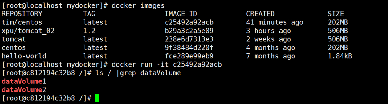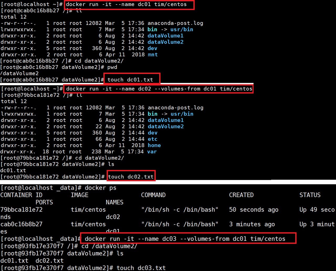 docker run -it --name dc02 --volumes-from dc01 tim/centos