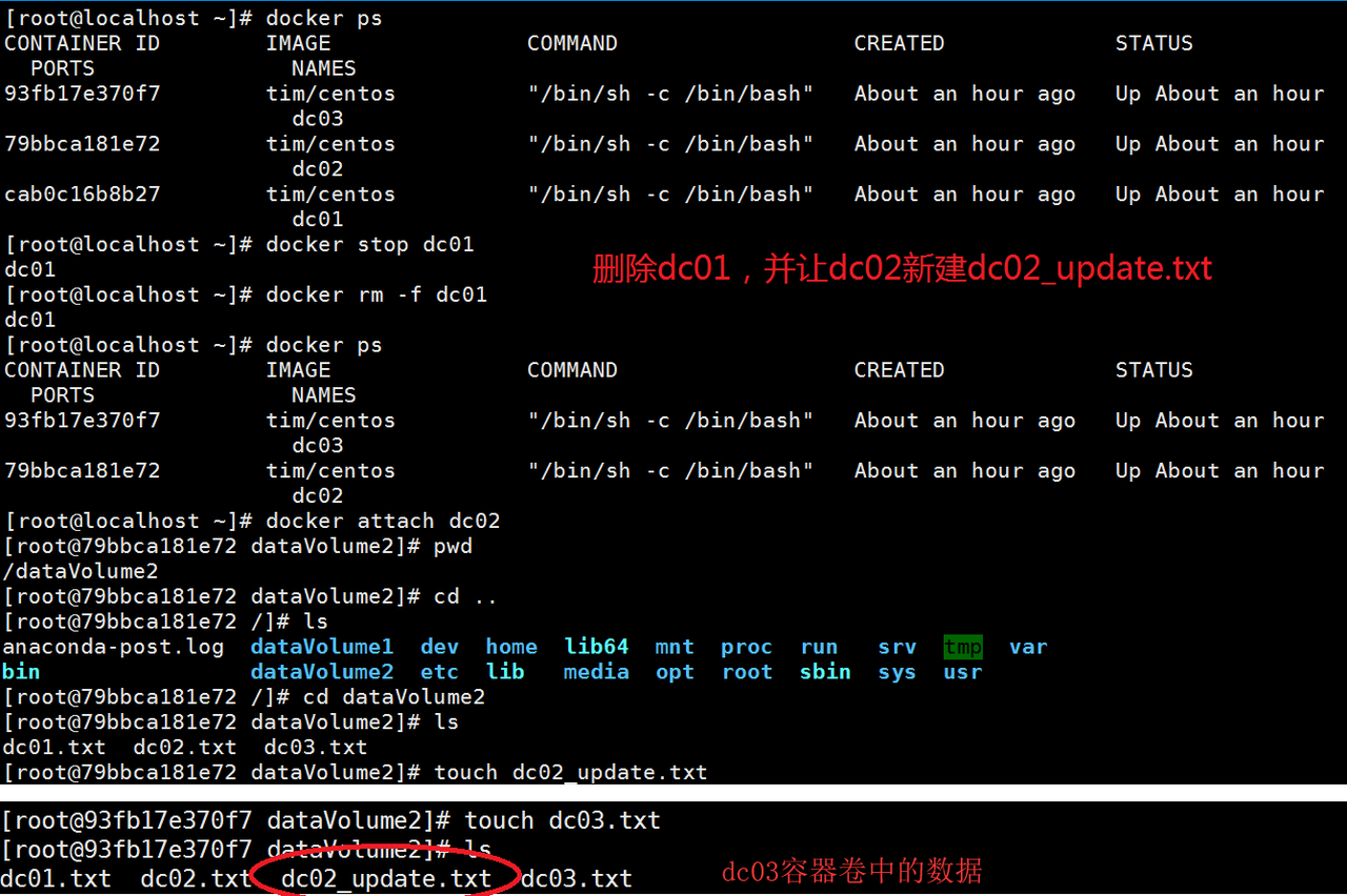 先见了三个容器,dc01是之前建好的,里面有容器卷dataVolume1,dataVolume2,剩下两个容器分别是dc02,dc03,然后通过