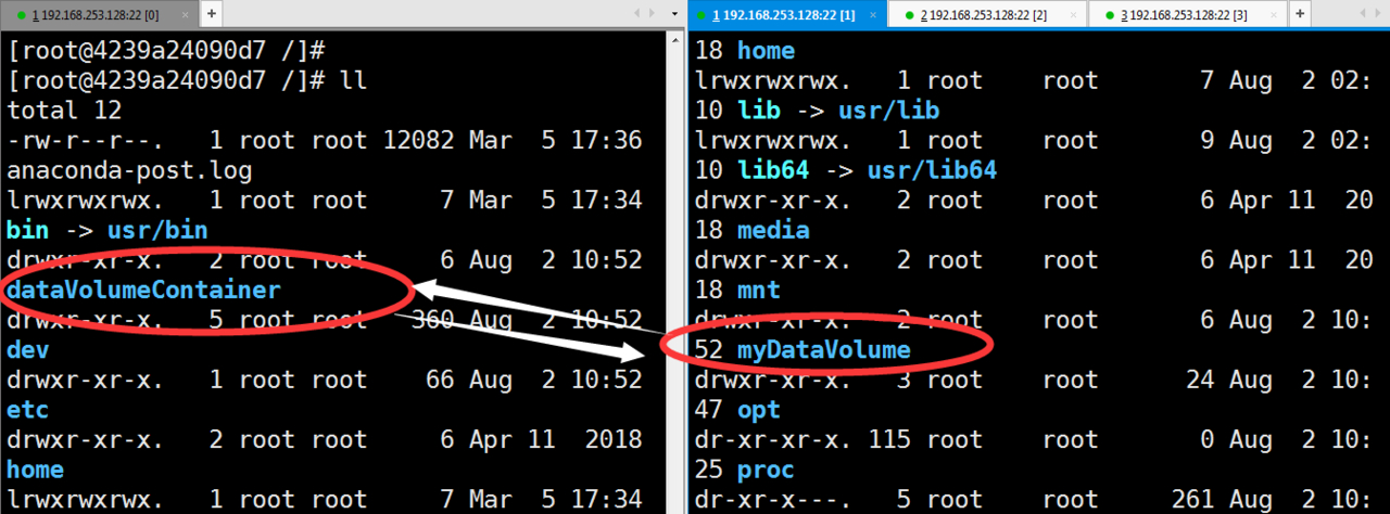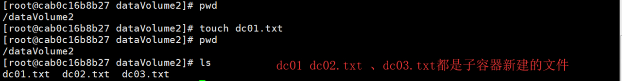 这样的命令去新建一个dc02容器继承父容器dc01,同样的,使用此命令新建dc03容器继承父容器dc01,于是dc02和dc03都含有一两个容器卷dataVolume1,dataVolume2,于是dc01、dc02、dc03都是数据共享的: