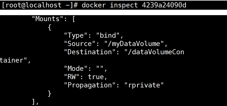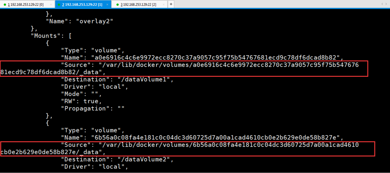 那么对应的宿主机器目录在哪呢?虽然我们没有手动指定,但是dockerfile有默认的路径,使用docker inspect 容器ID查看容器细节: