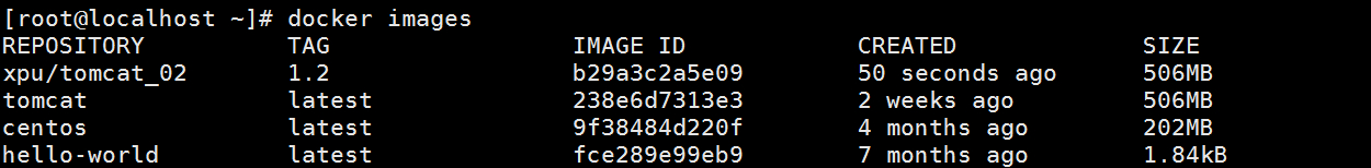 [root@localhost ~]# docker commit -m="This is my Tomcat" -a="Tim" 4f2161bbdb42 xpu/tomcat_02:1.2