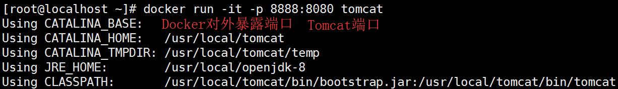 docker run -it -p 8888:8080 tomcat (使用-P是随机分配端口,分配的是Docker对外暴露的端口)