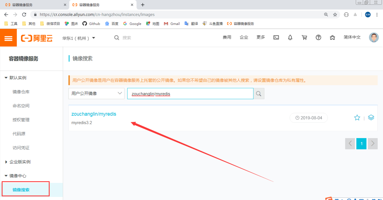 在阿里云执行搜索,一定要是公有仓库才能搜到,下面看看我的Redis