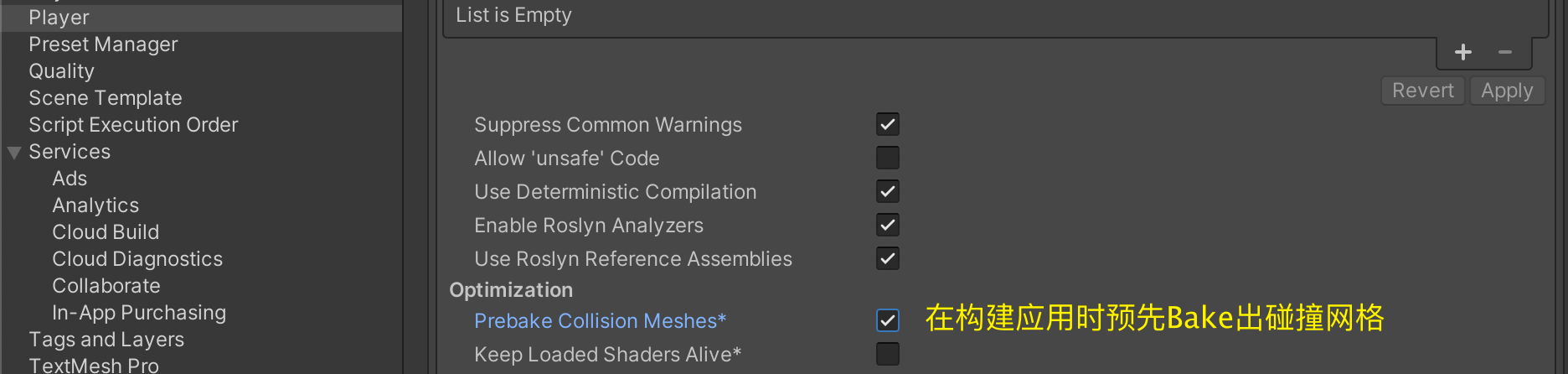 可以通过PlayerSetting选项中勾选Prebake Collision Meshes选项来在构建应用时预先Bake出碰撞网格