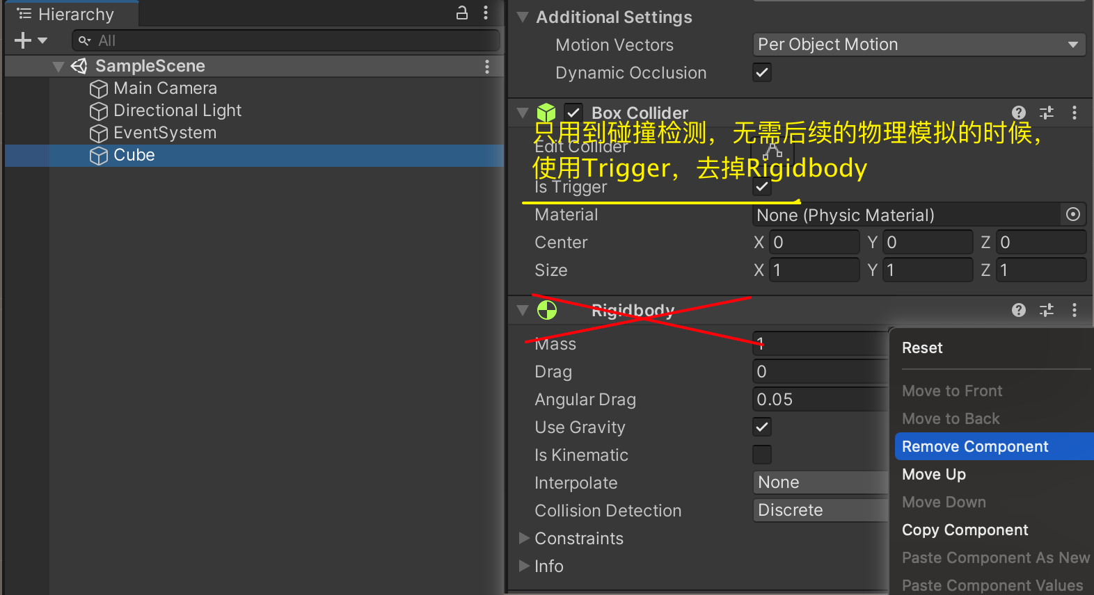 Trigger对象更高效,所以如果是仅仅只是碰撞检测,而非物理模拟的时候,最好去掉Collider,只保留Trigger即可