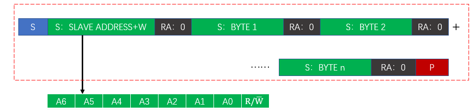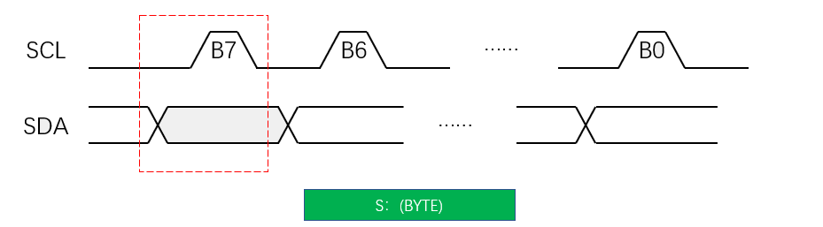 发送一个字节:SCL低电平期间,主机将数据位依次放到SDA线上(高位在前),然后拉高SCL,从机将在SCL高电平期间读取数据位,所以SCL高电平期间SDA不允许有数据变化,依次循环上述过程8次,即可发送一个字节。