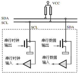 所有I2C设备的SCL连在一起,SDA连在一起;设备的SCL和SDA均要配置成开漏输出模式;SCL和SDA各添加一个上拉电阻,阻值一般为4.7KΩ左右;开漏输出和上拉电阻的共同作用实现了“线与”的功能,此设计主要是为了解决多机通信互相干扰的问题。下面是I2C总线挂接多个设备示意图: