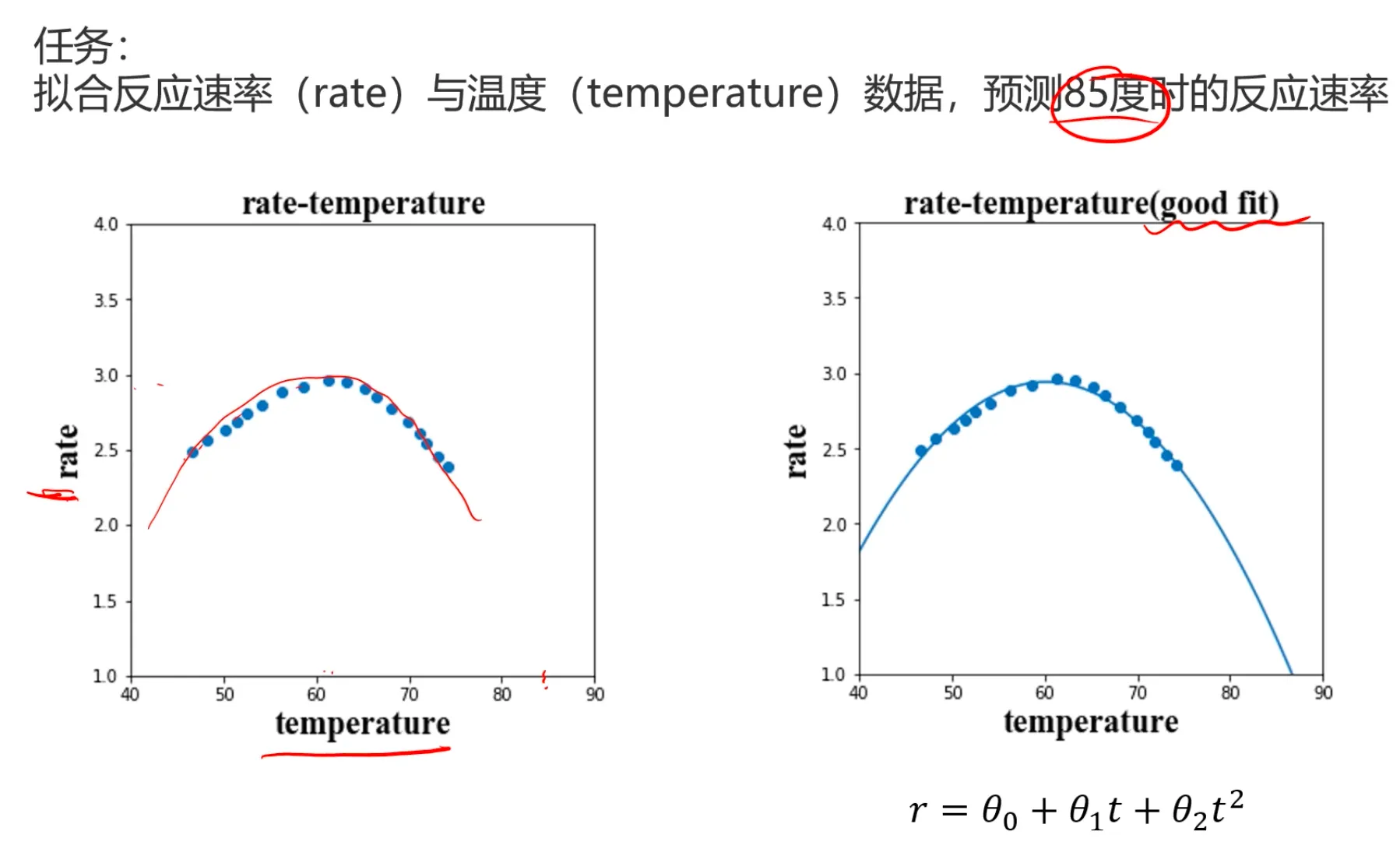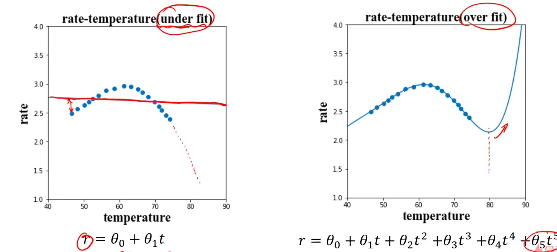 下面则分别是使用单项式回归导致的欠拟合问题,和使用过多附加项的多项式回归导致的过拟合问题: