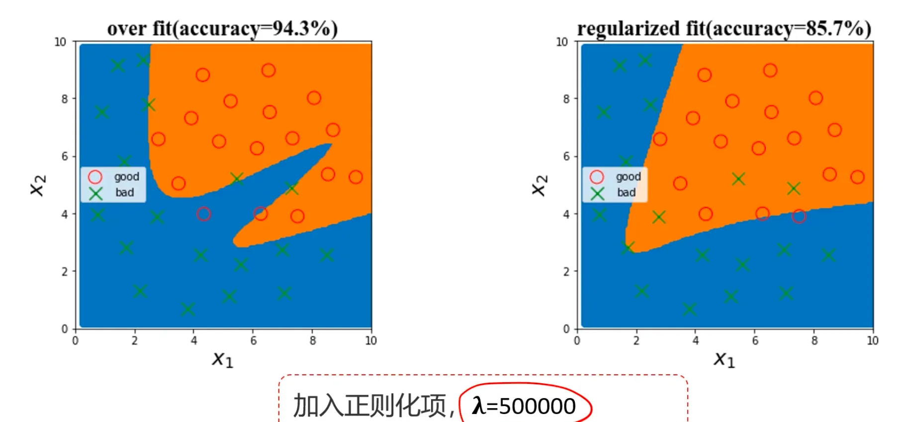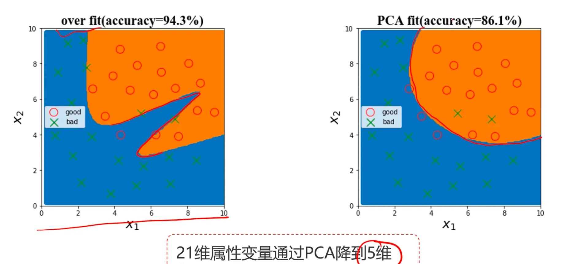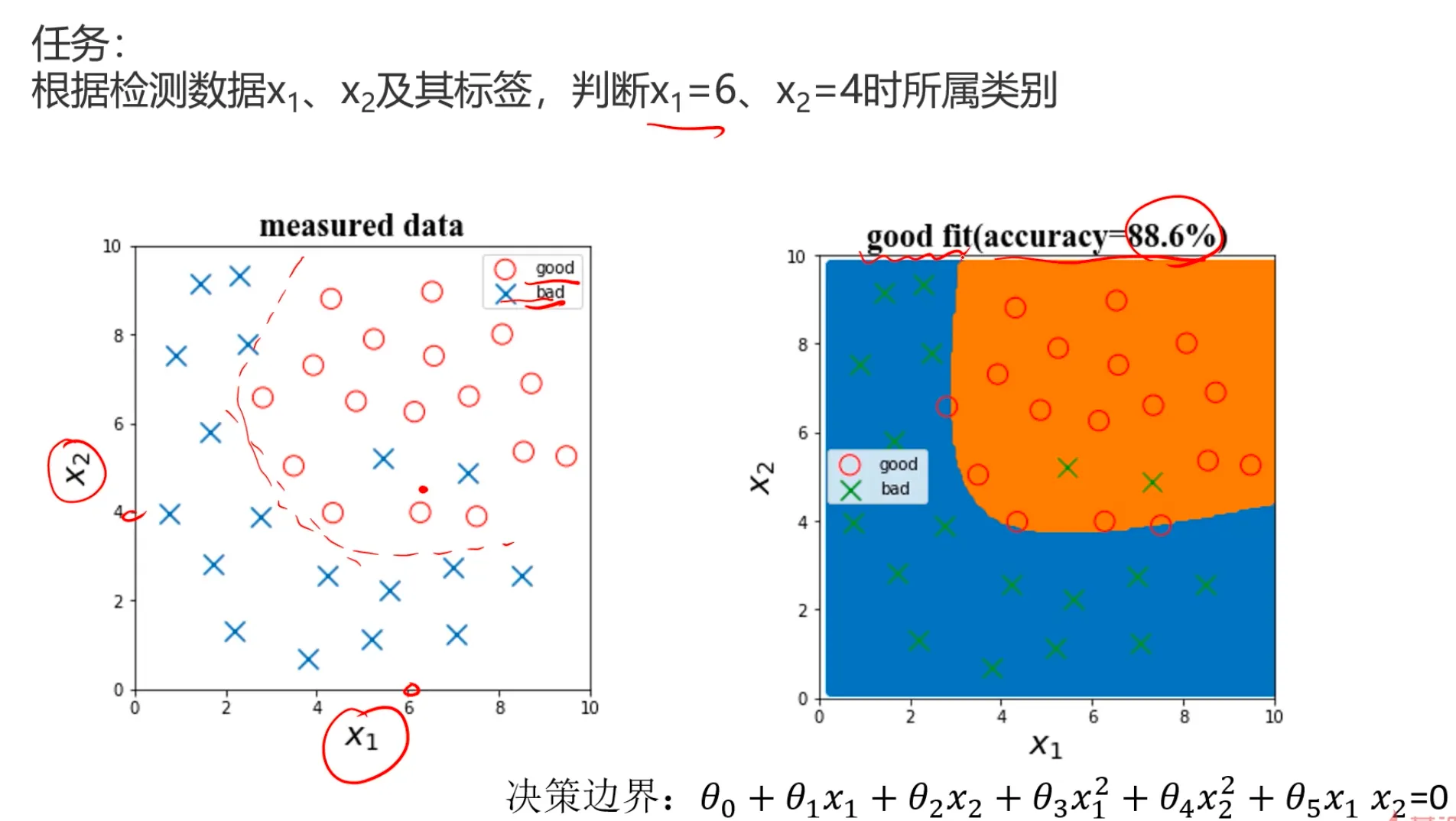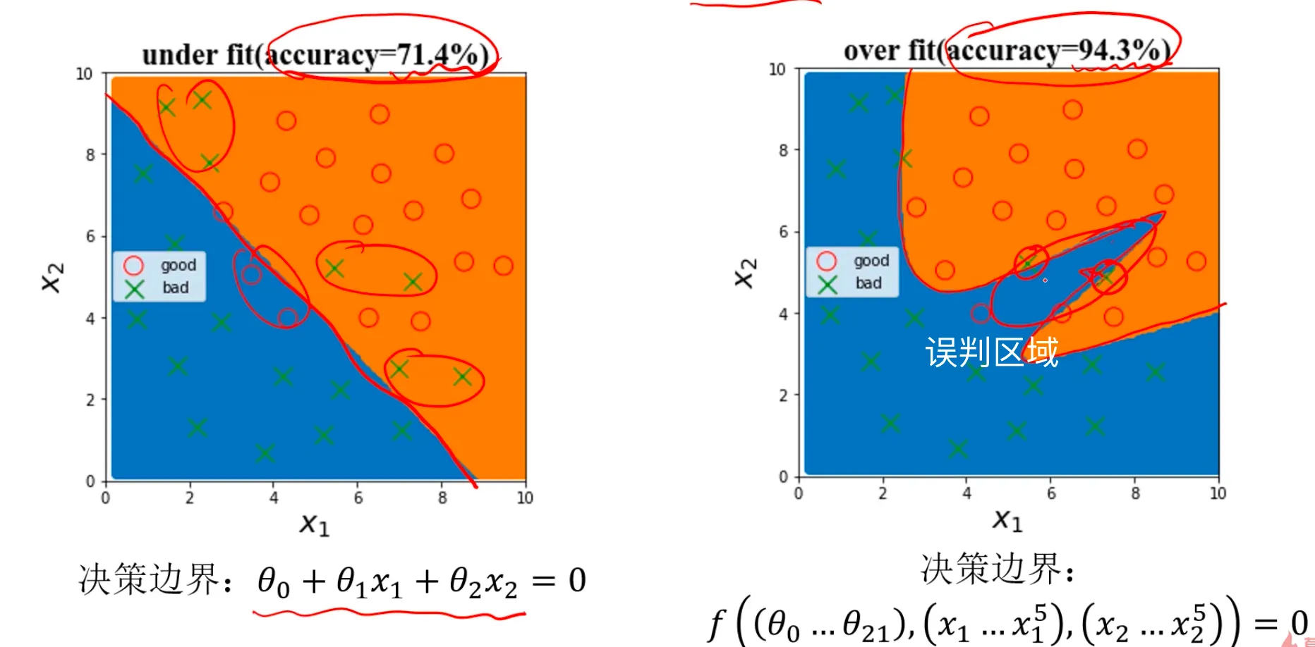 如果是单纯采用一阶边界不管是对于样本数据,还是预测数据都不准确,如果是采用复杂边界曲线,确实能很好的 把样本数据的准确率提的非常高,但是这样的模型一旦用于真实数据时会出现大量的误判,比如图片标注出来的区域,为了能完全拟合样本数据,却错判了实际的真实数据,这就是过拟合的危害。