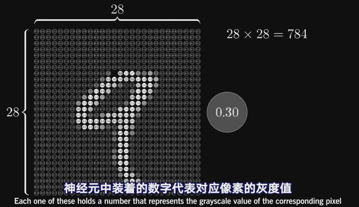 一张图片包含 $28 * 28$ 个像素,我们把这一个数组展开成一个向量,长度是 $28*28=784$。如果把数据用矩阵表示,可以把 mnist 训练数据变成一个形状为 $[60000, 7841]$ 的矩阵,第一个维度数字用来索引图片,第二个维度数字用来索引每张图片中的像素点。图片里的某个像素的强度值介于0-1之间。就像下面这样: