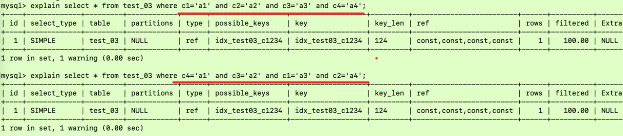 explain select * from test_03 where c4='a1' and c3='a2' and c1='a3' and c2='a4';