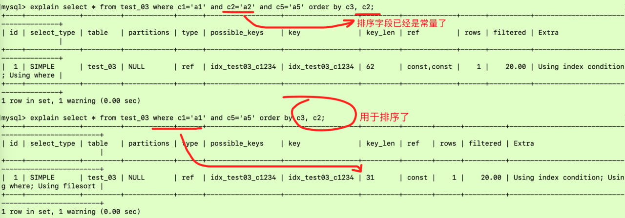 所以上面的SQL和explain select * from test_03 where c1='a1' and c2='a2' order by c3;