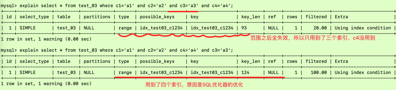 上面的SQL会导致c4这个索引失效,那么如果是c4的范围条件写前面呢?同样的道理,SQL优化器会对SQL语句做优化,优化后的语句成了explain select * from test_03 where c1='a1' and c2='a2' and c3='a3' and c4>'c4';