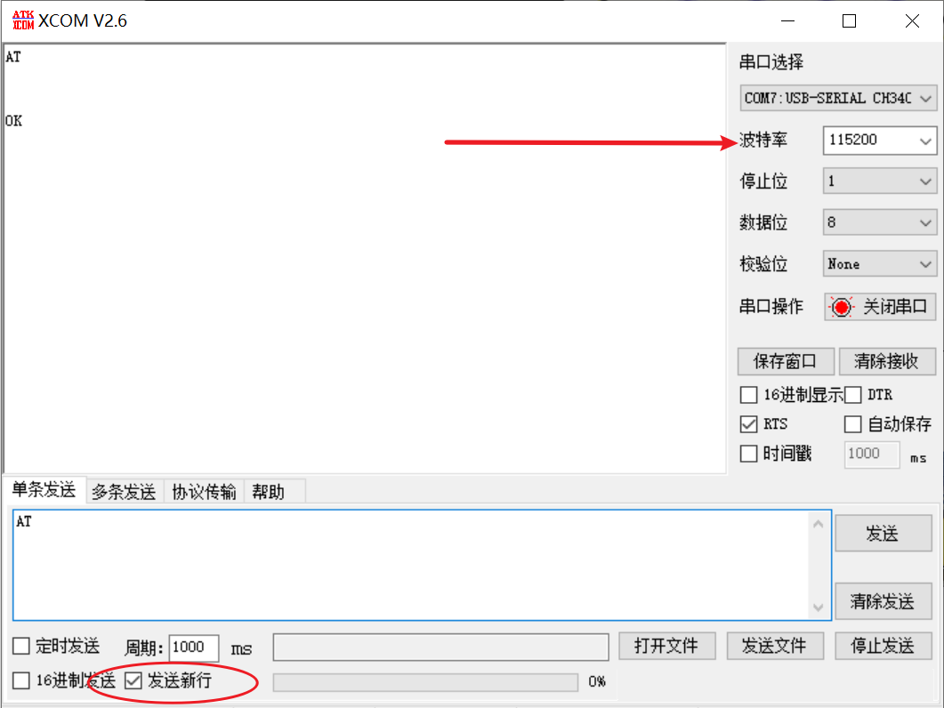 连接好后,就准备用电脑用串口调试助手向ESP8266发送AT指令即可,调试助手可使用XCOMV2,非常好用。 设置好串口调试助手的串口和波特率,ESP8266默认波特率为115200,把串口调试助手的波特率调为115200,并且 勾选左下角的发送新行。 在输入框中输入 AT 然后点击发送: